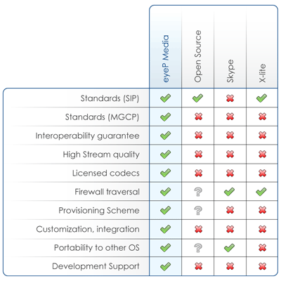 Standards: eyeP Media supports the latest developments in communication over IP standards (SIP, MGCP)